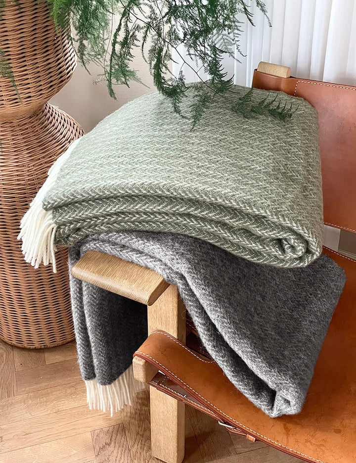 Vanligvis er det ikke nødvendig å vaske eller rense ull, siden den har selvrensende egenskaper og fibrene i seg selv har en unik struktur som avviser lukt og smuss. Det naturlige fettet i ullen bidrar også til å beskytte materialet ved at det danner en hinne som hindrer for eksempel bakterier i å trenge inn, noe som gjør hyppig vask eller rengjøring unødvendig. Hvis pleddet trenger rengjøring, anbefaler vi tørrrensing, slik at den vakre overflaten forblir uforandret så lenge som mulig.