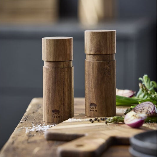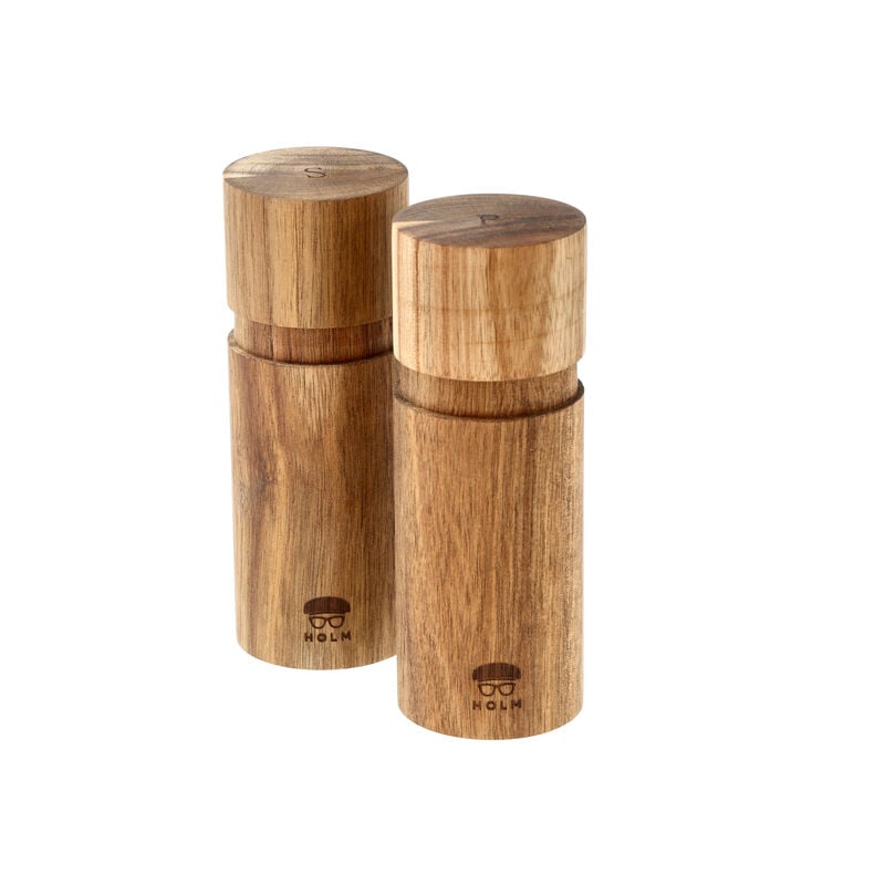 Vakkert salt- og pepperkvernsett i akasietre med keramisk kverninnsats. Kvernene har et maskulint utseende, og salt- og pepperinnholdet er merket med en diskret S eller P på toppen. Du kan selv bestemme hvor grovt eller fint du vil kverne. Kvernnivået justeres enkelt i bunnen av kvernen.