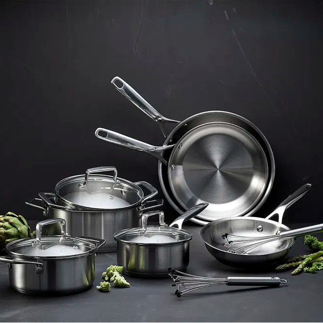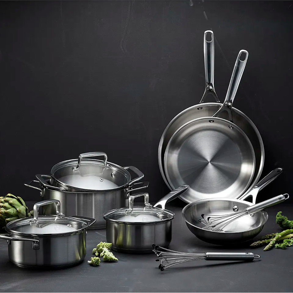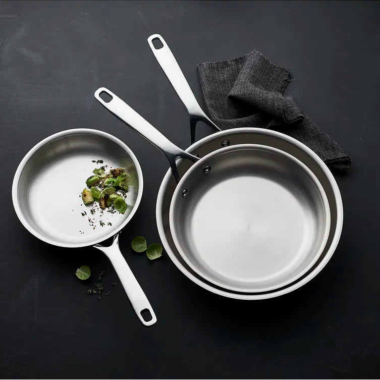 I bunnen av pannen finner du en aluminiumskjerne som er dekt av rustfritt stål på begge sider, også kalt en sandwichbunn, der det ytterste laget er magnetisk. Varmen fordeles og beholdes jevnt og energieffektivt over bunnen. Pannen kan brukes på alle varmekilder – fra tradisjonelle koketopper, keramiske topper og induksjonstopper til el- og gasskomfyrer. Kan vaskes i oppvaskmaskin. I tillegg tåler pannen stekeovn. Kjøkkenutstyrets unike egenskaper bevares år etter år hvis det vedlikeholdes på riktig måte. Vi anbefaler rengjøring med børste og varmt såpevann før første gangs bruk. Kjøkkenredskaper i alle materialer kan brukes. Steking i stålpanne Det er annerledes å steke i en panne av rustfritt stål enn i en panne med belegg, og det er nettopp derfor mange profesjonelle kokker foretrekker stekepanner av stål. Hell fett i pannen, og varm den opp ved middels varme. Fordel fettet over hele pannens stekeflate og på sidene. Øk temperaturen litt, legg maten i panne og juster varmen til ønsket tilberedningstemperatur. Til å begynne med kan det se ut som om maten brenner seg fast i pannen, men så snart den har fått en stekeskorpe, kan maten flyttes rundt i pannen og snus.