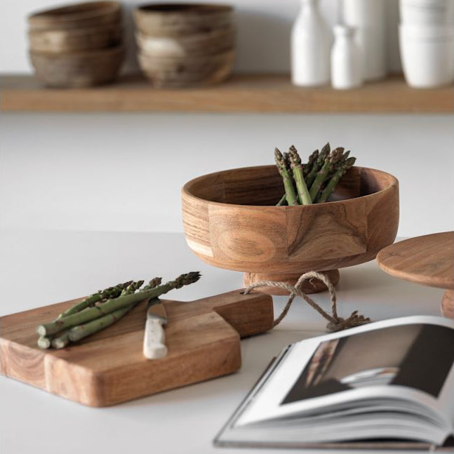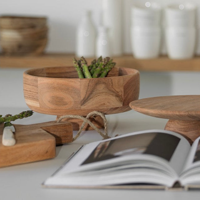 Tøff serveingsbolle på stett i akasietre, Ø25 cm. Perfekt til feks frukt på benken. Etter bruk skylles fatet først i kaldt vann før det vaskes i varmt rennende vann. Rengjort bolle settes jevnlig inn med en nøytral matolje for å hindre at fukt trekker inn.